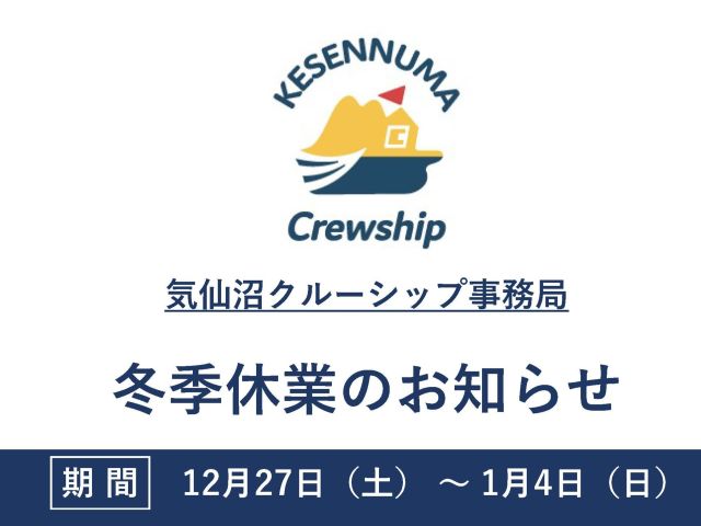 気仙沼クルーシップ事務局は、2025年12月27日(土)~2026年1月4日(日)の期間、冬季休業となります。