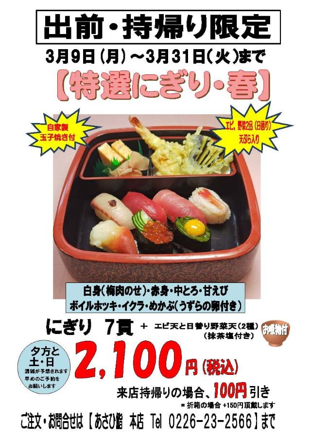 3/9(月)~3/31(火)まで、《 出前・持帰り限定 》【特選にぎり(春)】を販売します。